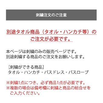 - ※刺繍はタオル・タオルハンカチ・バスローブ・バスドレスに入れることができます。お試し商品やヘアターバンやガーゼマフラー等には刺繍を入れることはできませんのでご了承ください。